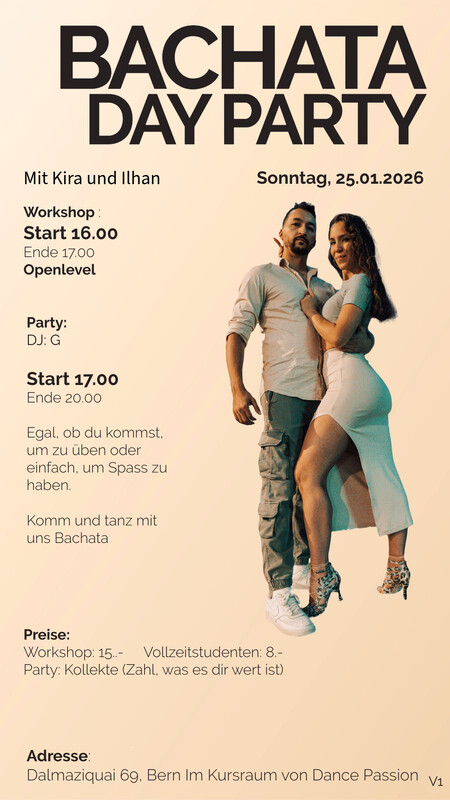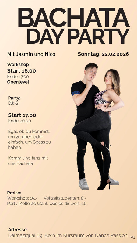 Dance Passion Dalmaziquai 69,Bern,SwitzerlandWorkshop: Start 16.00h Ende 17.00h Openlevel Party: DJ: G Start 17.00h Ende 20.00h Egal, ob du kommst, um zu üben oder einfach, um Spass zu haben. Komm und tanz mit uns Bachata Preise Nur Workshop:• Normalpreis: CHF 15.–• Vollzeitstudent:innen: CHF 8.– Nur Party:• Normalpreis: CHF 10.–• Vollzeitstudent:innen: CHF 6.– Kombi (Workshop + Party):• […]