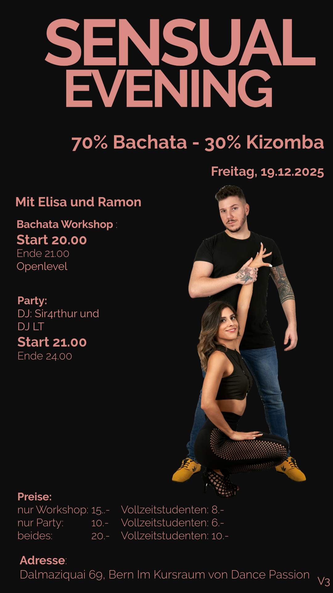 Dance Passion Dalmaziquai 69,Bern,SwitzerlandBachata Day Party 📚 Workshop mit Luana & Jose (Open Level) 🕔 Start: 17:00 Uhr🕕 Ende: 18:00 Uhr 🎧 Party mit DJ Streaming 🕕 Start: 18:00 Uhr🕘 Ende: 21:00 Uhr Egal, ob du kommst, um zu üben oder einfach, um Spass zu haben – komm vorbei und tanz mit uns Bachata! 💃🕺 💸 Preise Workshop• […]